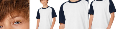 Short-sleeved base-ball T-shirt. Necktape. Contrasting collar. Raglan sleeves. Exact 2-ply crew neck. 1x1 ribbed collar with elastane. Bottom and sleeve hems with double topstitching. Side seams.