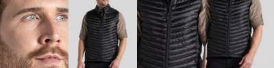 Water-resistant padded vest, with a full-length zip and 4 pockets, one of which doubles as a stow pocket. Recycled polyester mini ripstop with EcoShield DWR finish outer and lining. ThermoPro recycled polyester fill and recycled zip tapes. 4 pockets: 2 welted zipped lower, 1 concealed zipped inner and 1 passport RFID.