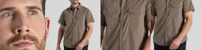 Short-sleeved shirt made with fabric too tough for insects to bite through. Recycled polyester cotton shirting and recycled zip tape. SolarShield collar. Nosi Defence technology.