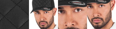 Diamond quilted Flexfit cap. Athletic Shape. Hard buckram. Silver coloured undervisor. Quilted leather imitation front.