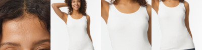 Wide straps. Rib knit trim applied to neckline and armholes. Side seam construction with stylish tapered fit. Twin needle bottom hem. Quarter-turned to eliminate centre crease.