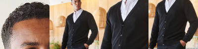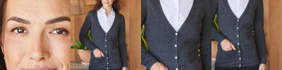 Fine knit 12 gauge. Semi fashioned set-in sleeves and neck detail. Horn effect dyed to match buttons. 1 x 1 neck and cuff rib.