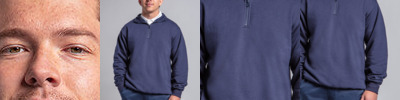 YKK zip and pull. Twin-needle stitching at arm, cuff and hem. 2x1 rib on cuff and hem. Heavier-weight fabric. Modern yet comfortable fit. Half-zip neck. Brushed inner fleece. Certified WRAP and SEDEX.