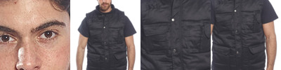 2 breast pockets with flaps. 2 side pockets with access. Hip and rule pocket. Stud front fastening. Side elastic.