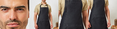 Denim bib apron with contrast stitching. Adjustable buckle on the neckband. Copper rivets. Four pocket compartments. 86cm long and 72cm wide.