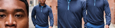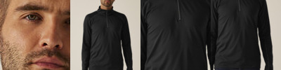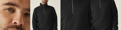 35% sustainable cotton and 65% polyester brushed back fabric. Ribbed cuffs and hem. Half-zip.