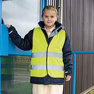 Generous in size allowing to be worn as an over garment. Black Polyester bound edges. 50mm sewn on safety tapes. Note: these garments should be worn fastened and kept clean to maintain effectiveness. Conforms to EN1150 – 89/686/EEC directive Size - Age S - 4/6 , M - 7/9 , L - 10/12 Chest to fit 22.5/24”, 25/27.5”, 29/31”
