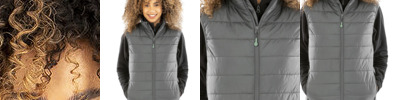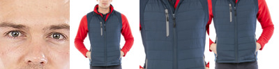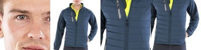 On-trend padded plus softshell combination. Supersoft, lightweight and warm. Ready to brand. Quiet to wear. Contrast colour pocket zips. Full front zip with chin guard. Stand-up padded collar. Padded body. Soft bound armhole. Black zip pulls. Hangtag.